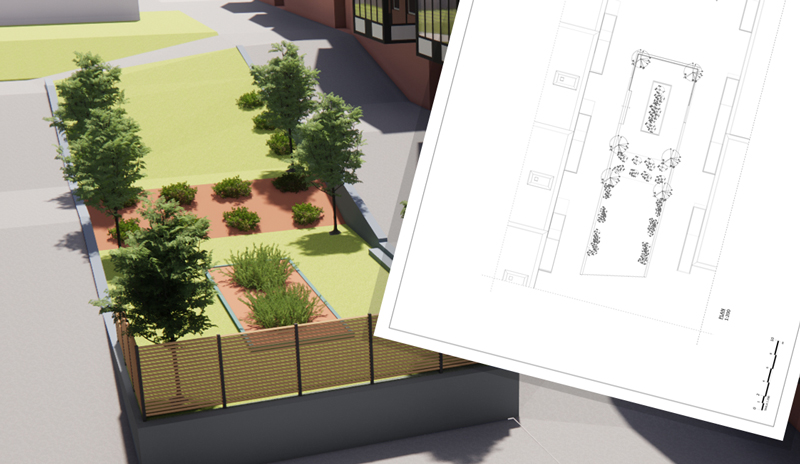 växtval och måttangivelser för respektive del i trädgården. I momenten ingår bygglovs-, konstruktions- och elevationsritningar enligt offererad omfattning.